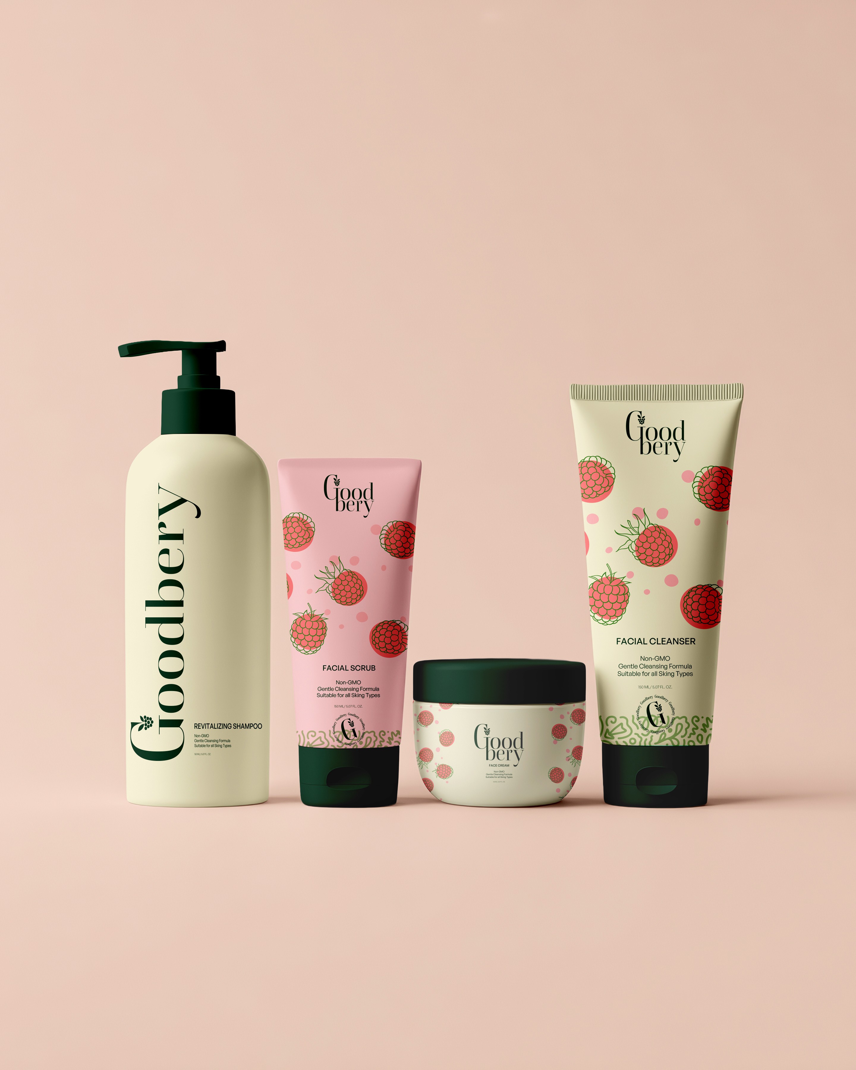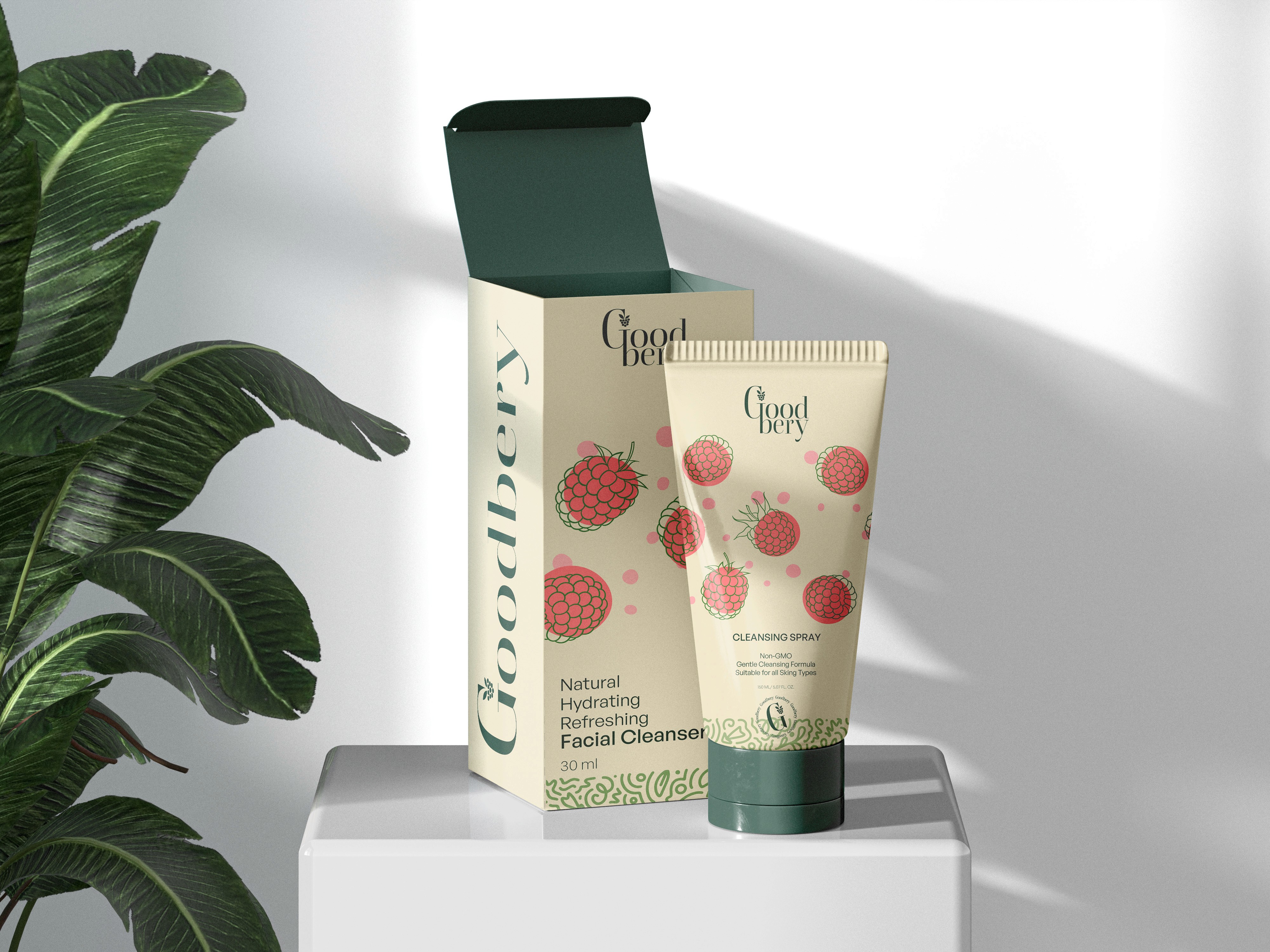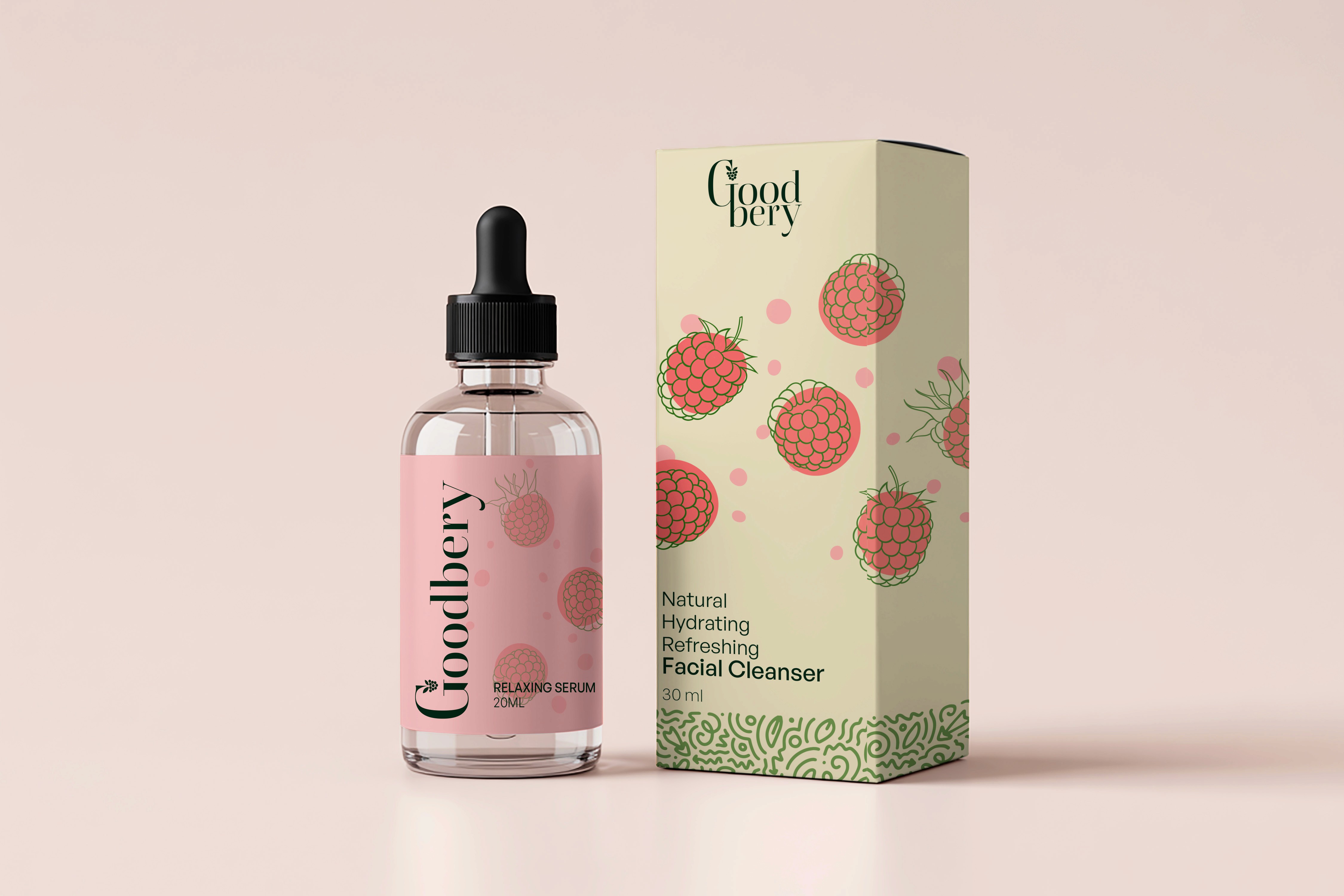 Goodbery is a conceptual packaging design exploring how natural beauty brands can communicate purity and transparency through visual design. This self-initiated project developed a complete packaging system—from product containers to label design—that balances organic aesthetics with modern, clean presentation.